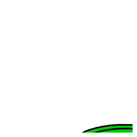 A cartoon dog, resembling a Boston Terrier, with black and white fur, holding a green flying disc in its mouth with its tongue sticking out.