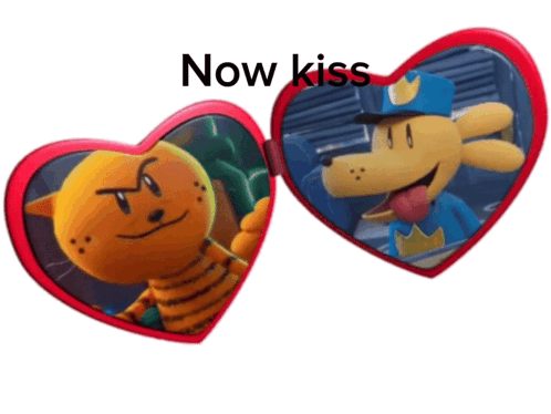 Animated sticker featuring Dog Man and Petey in a heart locket, with the text 'Now kiss' before it closes into a red heart.