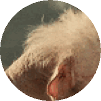 A pixelated close-up of Dogpool's ear, a character from Deadpool & Wolverine, shown within a circular frame.