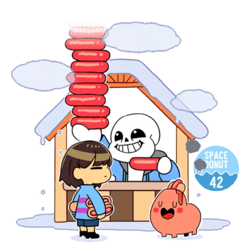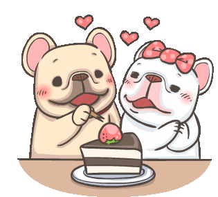 Two adorable cartoon French Bulldogs, one with a bow, sharing a slice of chocolate cake with a strawberry.