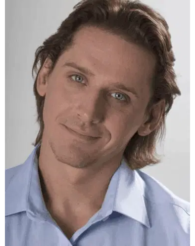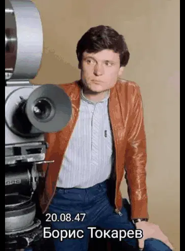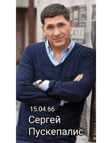 a man in a blue sweater is standing with his arms crossed in front of a newspaper