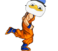 Dolan Dolamis, a pixel art meme character with a duck head and orange pants, referencing Goku and One Piece.
