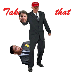 Donald Trump, wearing a MAGA hat, holds the heads of Brett Kavanaugh and Don Lemon, with 'Take that' text.