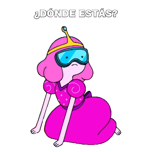 Princess Bubblegum from Adventure Time, wearing goggles, looks worried with the text '¿Dónde Estás?' (Where Are You?) above her.
