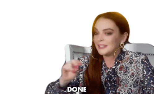 Lindsay Lohan smiles and gestures with a fist as the word 'DONE' appears, signifying completion or finality.