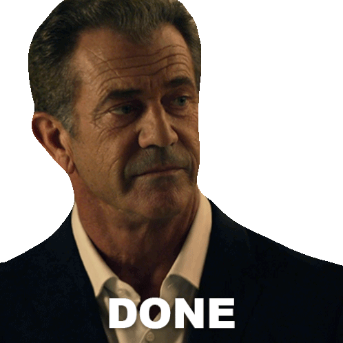 Mel Gibson as Stonebanks from The Expendables 3, with 'DONE' text. A powerful reaction sticker.