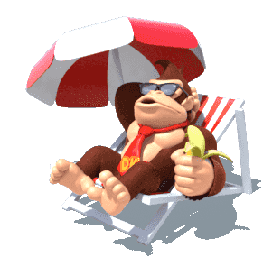 Donkey Kong relaxes in a beach chair under an umbrella, wearing sunglasses and enjoying a banana leaf.