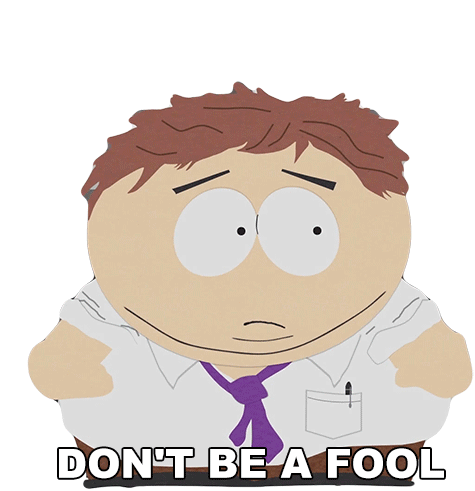Eric Cartman from South Park advises 'Don't Be A Fool' with a serious expression in this animated sticker.