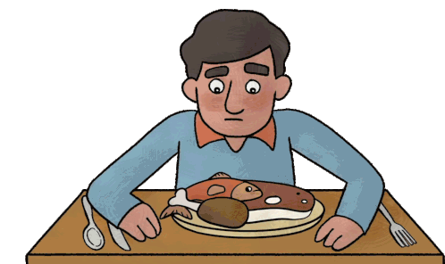 A man looks indecisively at a plate of food, first meat and fish, then a variety of vegetables, contemplating his meal choice.