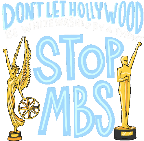 A protest message urging to stop Mohammad Bin Salman Al Saud from influencing Hollywood, featuring two golden statues.