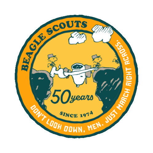 Snoopy as a Beagle Scout astronaut, celebrating 50 years since 1974, with the motivational phrase "Don't Look Down, Men. Just March Right Across."