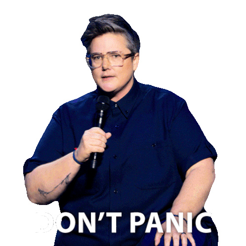 Hannah Gadsby, the comedian, delivers a calm "Don't Panic" message, possibly from her "Something Special" show.
