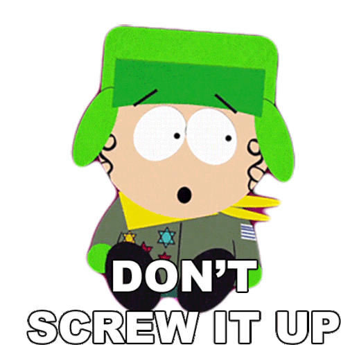 Kyle Broflovski from South Park looks worried, delivering the stern message 'Don't Screw It Up'.