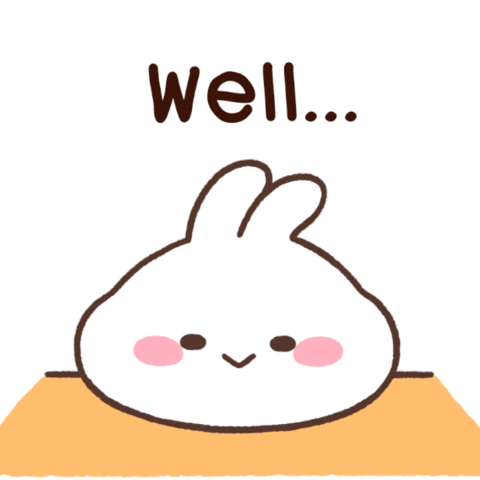 A cute cartoon rabbit peeks over a surface, then says 'well...' with a hesitant expression.