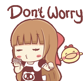 A cute cartoon girl with long hair eats cake, accompanied by a chick, with the comforting message 'Don't Worry'.