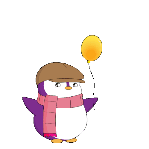 A cute Pudgy Penguin, wearing a hat and scarf, happily appears from behind a pile of colorful, frosted donuts.