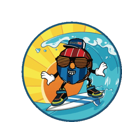 The cool Donut Dude from Donutnv Doughnutnv, wearing sunglasses and a cap, rides a wave on his surfboard under a sunny sky.