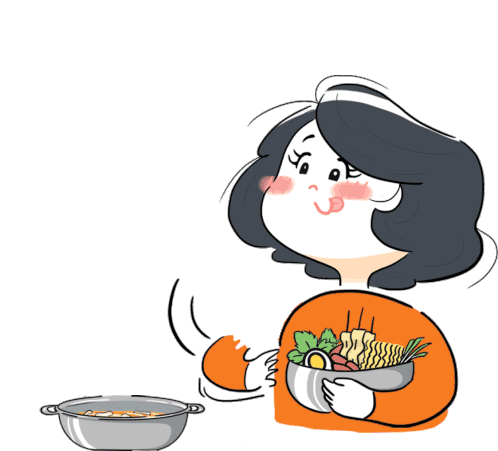 A cute animated character enjoying a bowl of delicious Dookki tteokbokki and other food, showing delight and enjoyment.