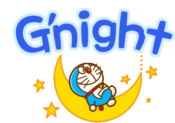 Doraemon sleeping peacefully on a crescent moon surrounded by twinkling stars, wishing everyone a cute goodnight.