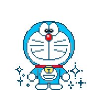 Cute pixel art Doraemon appears, vanishes, and waves hello in this animated sticker.
