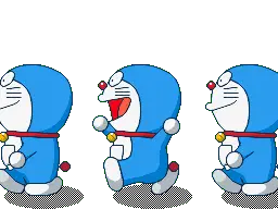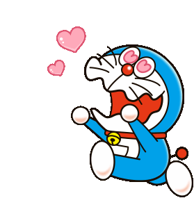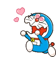 Doraemon and Dorami express extreme excitement and love, surrounded by floating pink hearts.