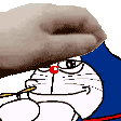 A humorous animated sticker featuring Doraemon as Pepe the Frog, holding a toothpick in his mouth with a smug expression.