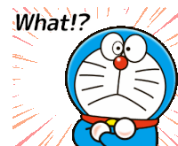 Doraemon, the blue robotic cat, looks surprised and confused with arms crossed, exclaiming 'What!?'