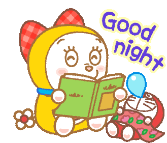 Dorami reads a green book while Doraemon sleeps soundly under a patterned blanket with a blue balloon, wishing "Good night".