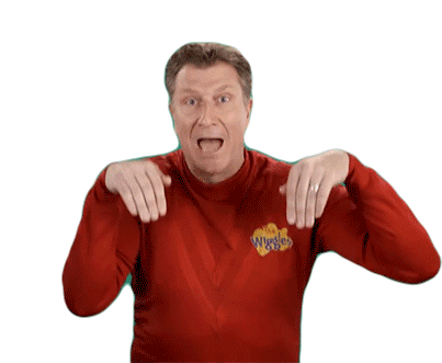 Simon Pryce, the Red Wiggle, moves his hands and body downwards, indicating "down" or "lower" in this animated sticker.