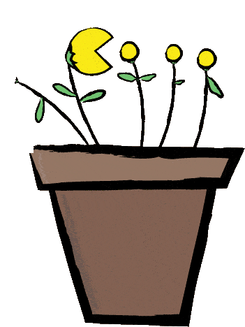A yellow Pac-Man-like flower in a pot chomps on smaller flowers. From Downsign H Ate Sticker by Sam Omo.