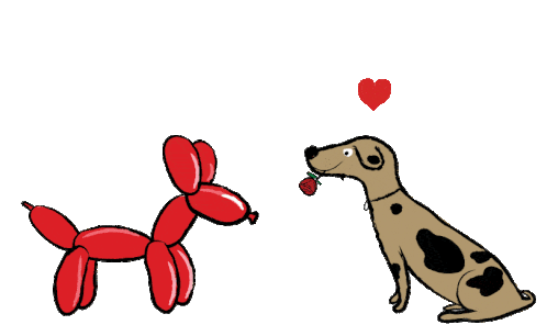 A Downsign dog offers a rose to a balloon dog, with hearts floating above, embodying "Love Is Blind."