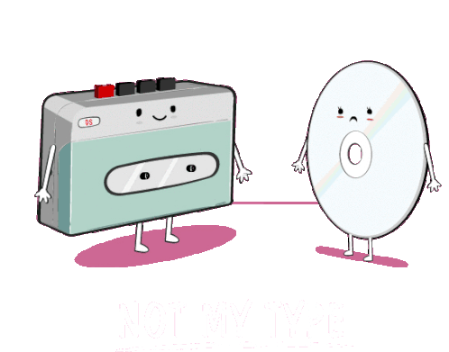 A cute cassette player rejects a sad CD with the pun "Not My Type," highlighting a humorous generational media clash.