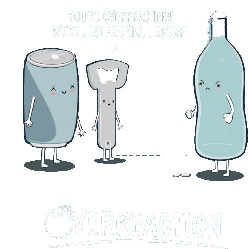 An angry bottle overreacts to a soda can and bottle opener, who claim they're 'just friends'.