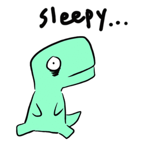 A cute, light green cartoon dinosaur character is shown dozing off, with the word 'Sleepy...' appearing above it.