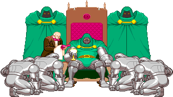 Doctor Doom sits regally on his throne, attended by a man in a suit and surrounded by kneeling robots.