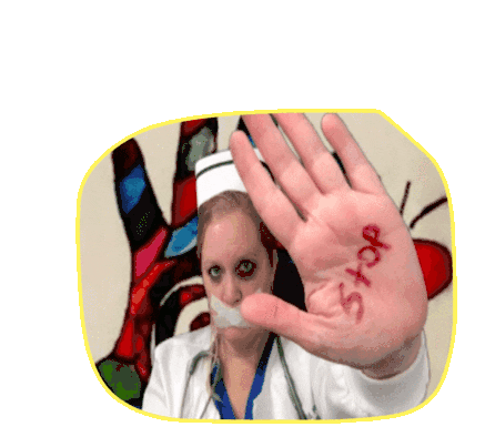 Dr Sandy Risoldi, a nurse with taped mouth, holds up a hand with 'Stop' written on it, symbolizing silence and protest.