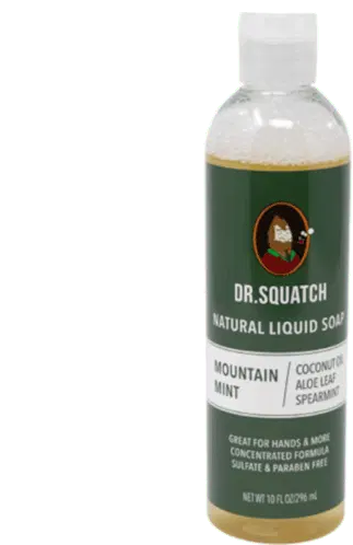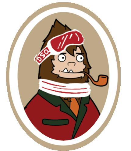 A cartoon Dr Squatch sasquatch logo, featuring the character with ski goggles, a pipe, and a stylish jacket.