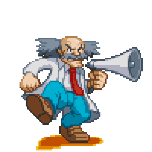 Dr. Wily, the iconic Mega Man villain, angrily yells into a megaphone, stomping his foot to emphasize his command.
