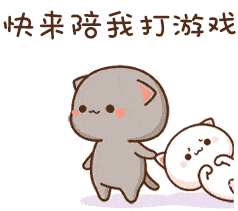 A gray cat playfully drags a reluctant white cat, with the caption 'Come play games with me'.