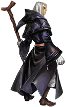 A powerful mage from Dragon's Crown, clad in a dark hooded robe and holding a staff, ready for adventure.
