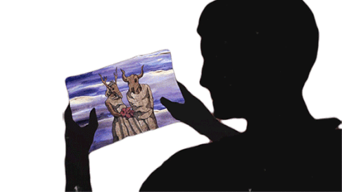 A silhouette tears a picture depicting an angry, horned gargoyle figure with a stern expression.