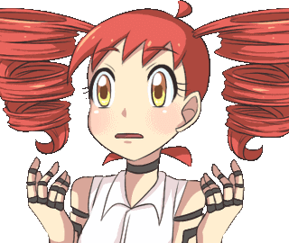 A Dream Robot Girl with red hair and wide eyes reacts with extreme shock and surprise, mouth agape.