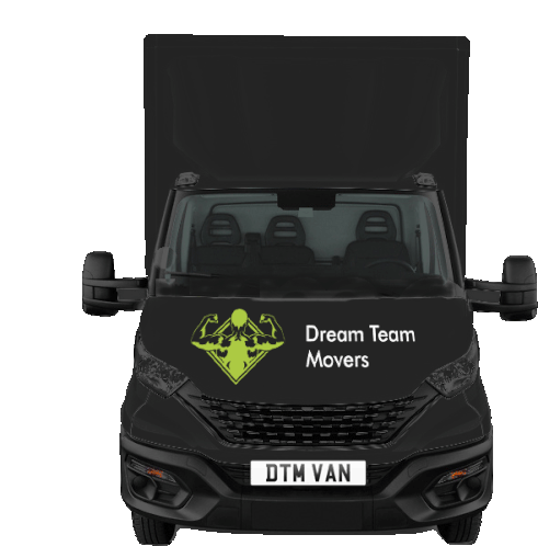 Animated sticker of a black moving van with the 'Dream Team Movers' logo and 'DTM VAN' license plate.
