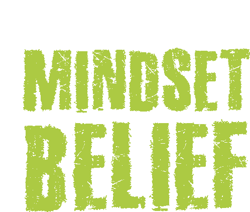 A vibrant green distressed text sticker displaying the words 'MINDSET' and 'BELIEF' for motivation.