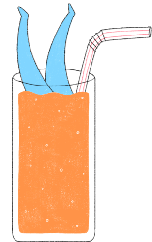 A whimsical cartoon of blue legs submerged in a glass of bubbly orange juice with a straw, perfect for a relaxing drink.