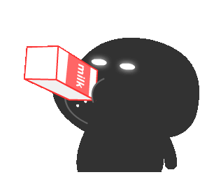 A simple black silhouette character with glowing eyes drinks milk directly from a carton, showing a quick gulp.