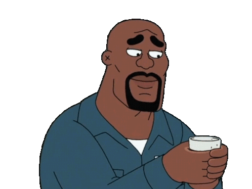 Julius, an animated character, happily sips coffee from a white mug, enjoying a relaxing coffee break.