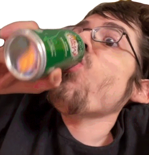 Ricky Berwick drinks from a green soda can, then looks up with wide, surprised eyes, capturing a funny moment.