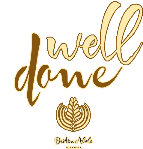 Animated 'Well Done' message with Dritan Alsela's signature and a coffee logo, perfect for baristas and coffee lovers.