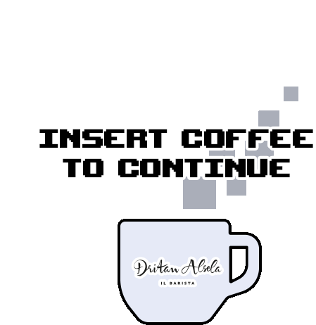 Dritan Dritan Alsela's iconic coffee quote, 'Insert Coffee To Continue,' with a stylish coffee cup.